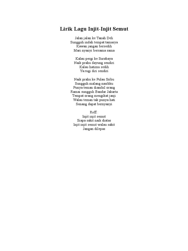 Lagu ini dimuat dalam album kompilasi the mercy's berjudul tribute to the legend series, vol. Permainan yang diiringi dengan lagu ini sangat sederhana, yaitu dilakukan dengan mencubit punggung tangan temannya. Dapatkan lirik lagu lain oleh rinto harahap di kapanlagi.com Jalan jalan ke tanah deli sungguh indah tempat tamasya kawan jangan bersedih mari nyanyi bersama sama kalau pergi ke surabaya naik prahu dayung sendiri kalau hatimu sedih ya rugi diri sendiri naik prahu ke pulau sribu sungguh malang nasibku punya teman diambil orang ramai sungguh bandar jakarta tempat orang mengikat janji More images for teks lagu injit injit semut » Jalan jalan ke tanah deli sungguh indah tempat tamasya kawan jangan bersedih mari nyanyi bersama sama. Injit injit semut artist : Naik prahu ke pulau sribu sungguh malang nasibku punya teman diambil orang ramai sungguh bandar jakarta tempat orang mengikat janji Jalan jalan ke tanah deli. About press copyright contact us creators advertise developers terms privacy policy & safety how youtube works test new features press copyright contact us creators. Kalau pergi ke surabaya naik prahu dayung sendiri kalau hatimu sedih ya rugi diri sendiri.